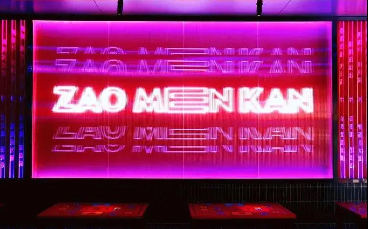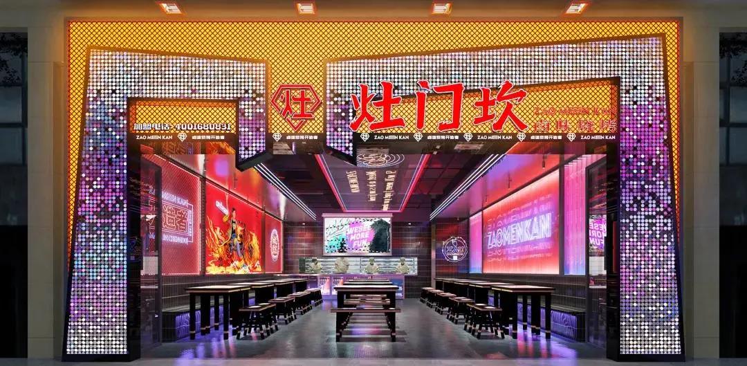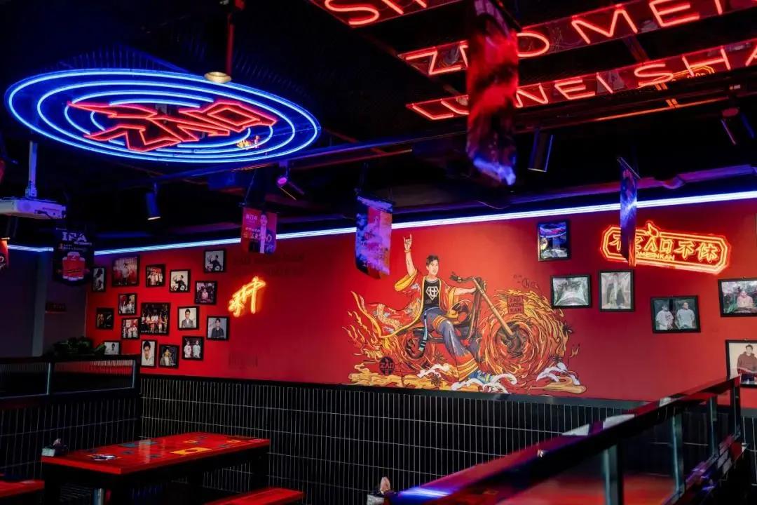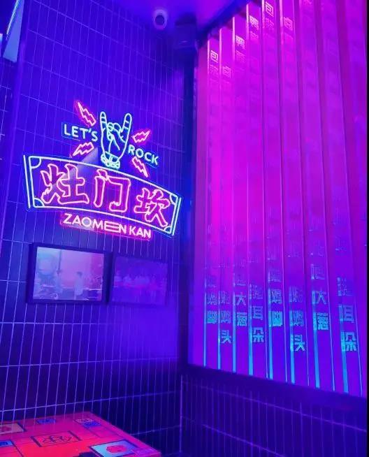 灶门坎卤味烧烤的空间设计,夜店元素十分明显,迎合年轻人喜欢的时尚感,这也与其他的烧烤店有了区别。