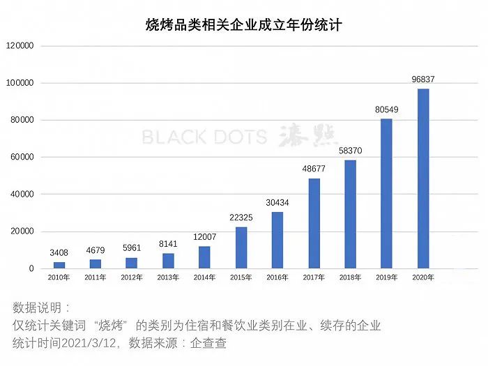 相比起火锅市场的饱和,烧烤正处于飞速发展的冲刺阶段。疫情期间,在餐饮业其它品类呈20%-30%降幅的情况下,烧烤品类却逆势增长,位居第一,是名副其实的黑马。