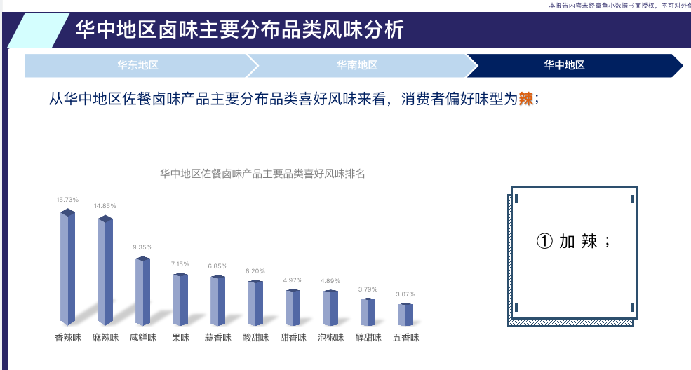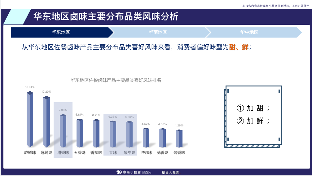 以上图为例,松井家联合章鱼小数据,深入市场,展开调研,经过大数据赋能,精准分析出:以卤味为例,不同地区的消费者有着不同的喜好风味。华中地区的消费者更偏好辣,而华东地区的消费者更偏好甜、鲜……