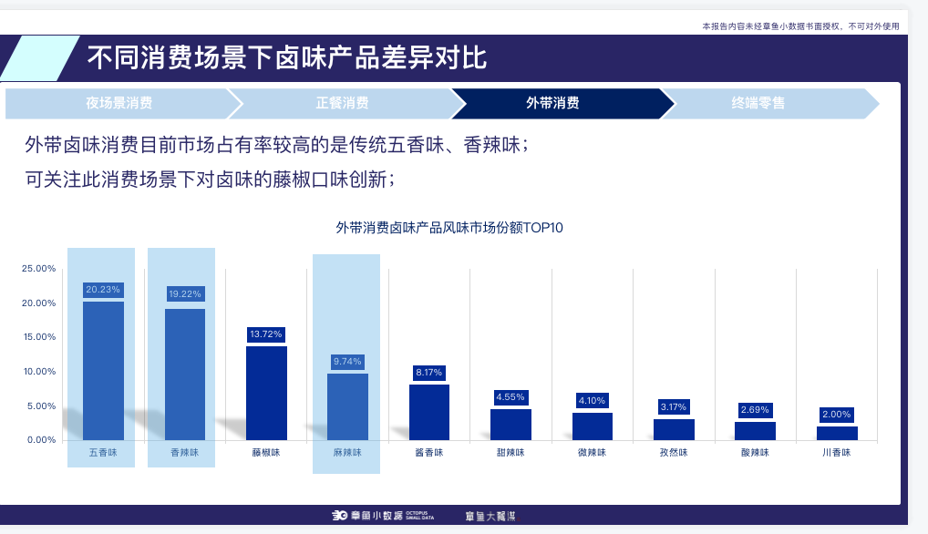 以外带卤味消费为例,目前市场占有率较高的是传统五香味、香辣味,而藤椒味占有率偏低,但也收到了终端消费者的偏爱,因此,针对此消费场景下对卤味的藤椒口味创新,是符合市场发展的有效预测。