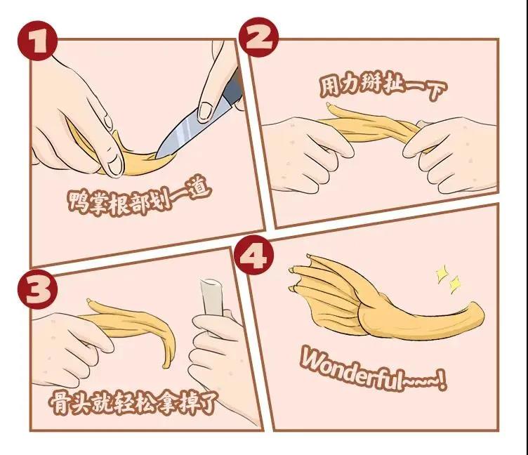 右手持小刀,用刀尖,再用手掐去爪的趾尖(也可提前先剁去),然后用拇指和食指捏住爪趾骨的前端,由爪尖向掌心方向推送,