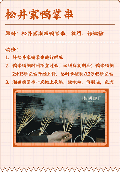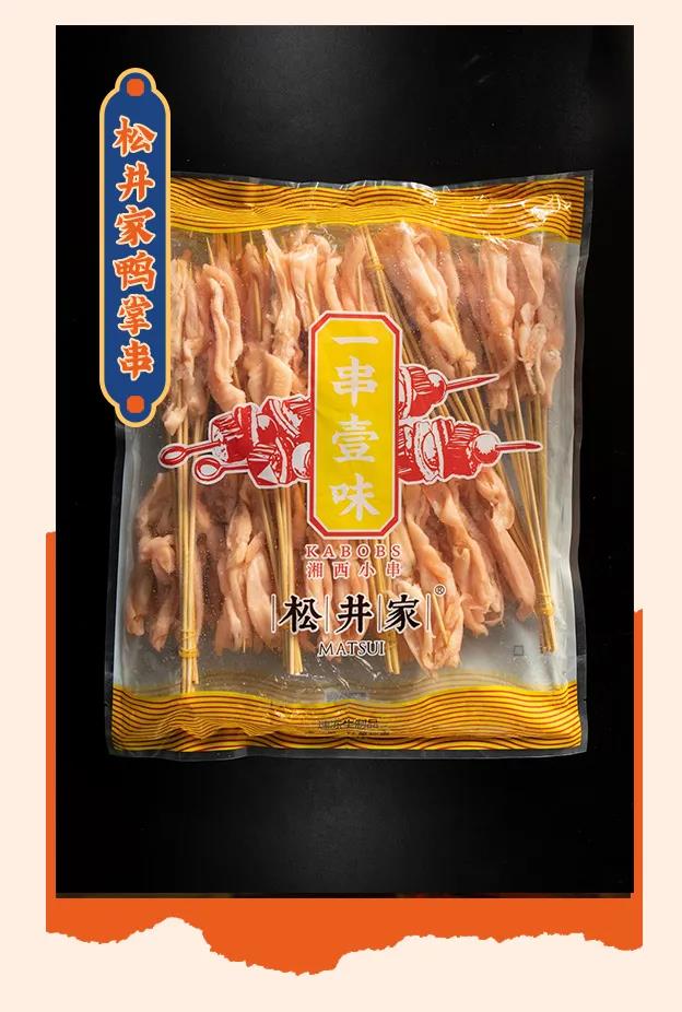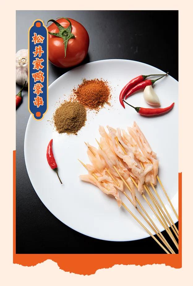 作为夜场景食材品牌运营商的松井家,在选材开始就十分重视。松井家的湘西鸭掌串,选用农家散养鸭,自由奔走在田间,味道也是极好的。